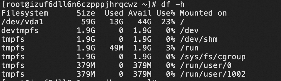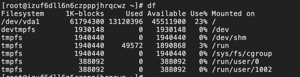 - df:显示磁盘空间使用情况。当线上服务器报警磁盘满的时候,需要上去查看磁盘占用情况,可以使用这个命令