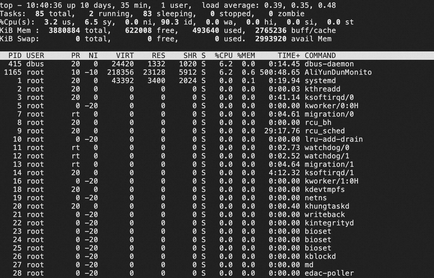 - top:实时显示系统进程和资源使用情况。当线上报警CPU占用率过高,load飙高的时候,我们通常会先上去使用top命令看一下具体哪些进程耗费了资源。