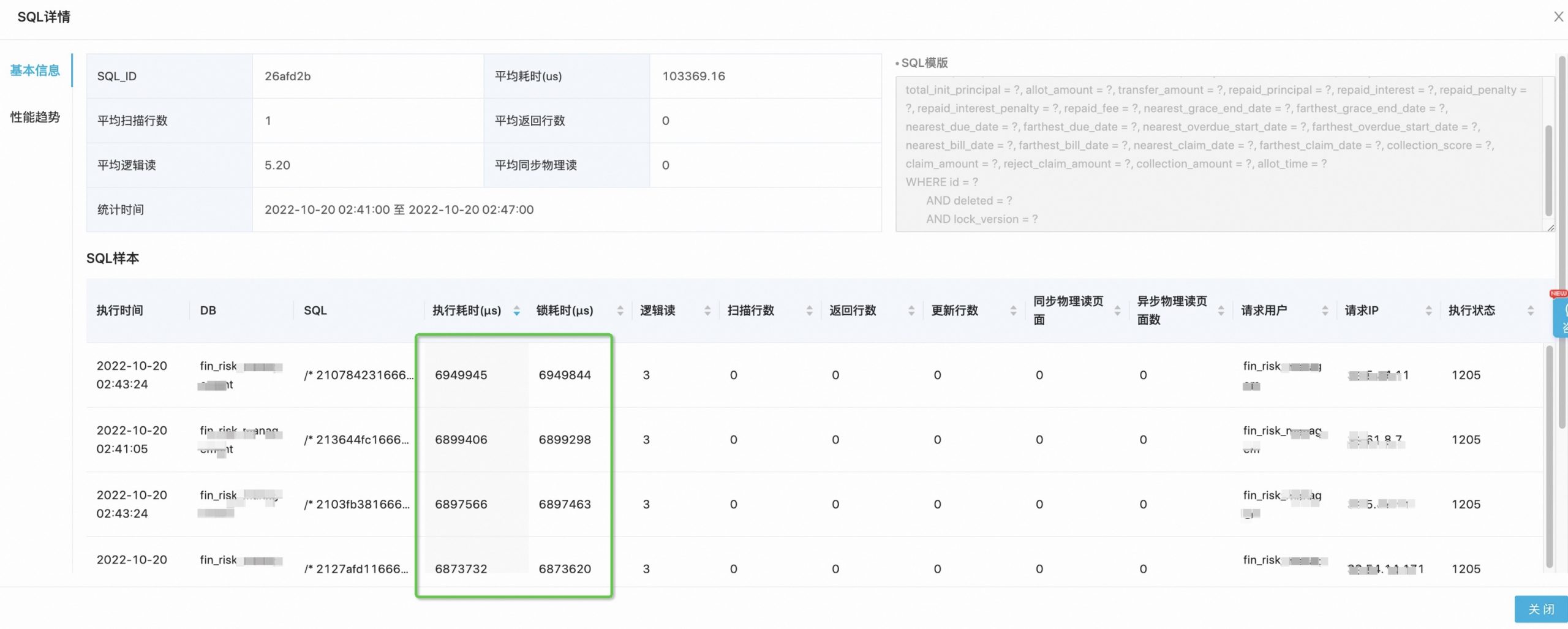 于是怀疑是慢SQL,然后去排查了一下SQL耗时,发现有大量的耗时SQL,并且执行耗时和锁耗时差不多是相等的。(公司内部工具)