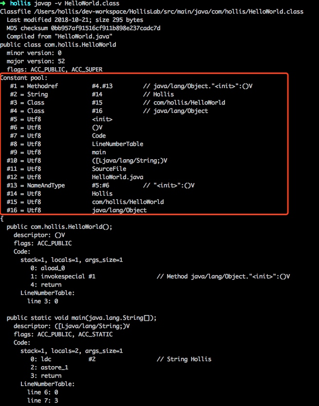 当然,还有一种比较简单的查看Class文件中常量池的方法,那就是通过javap命令。对于以上的HelloWorld.class,可以通过
